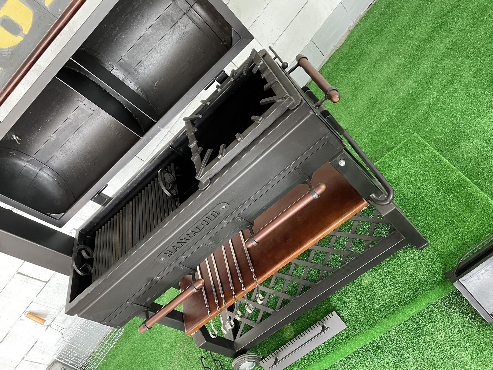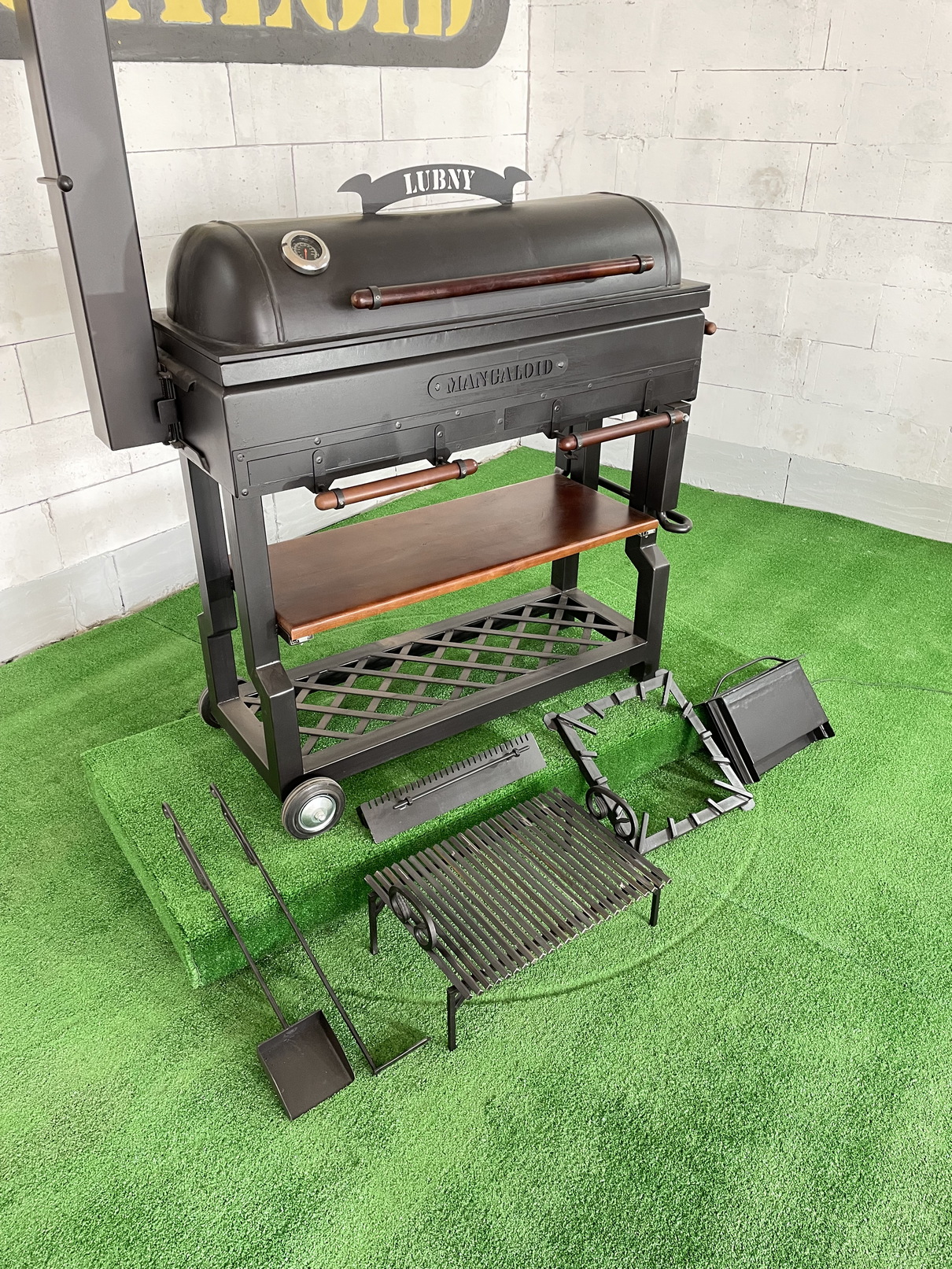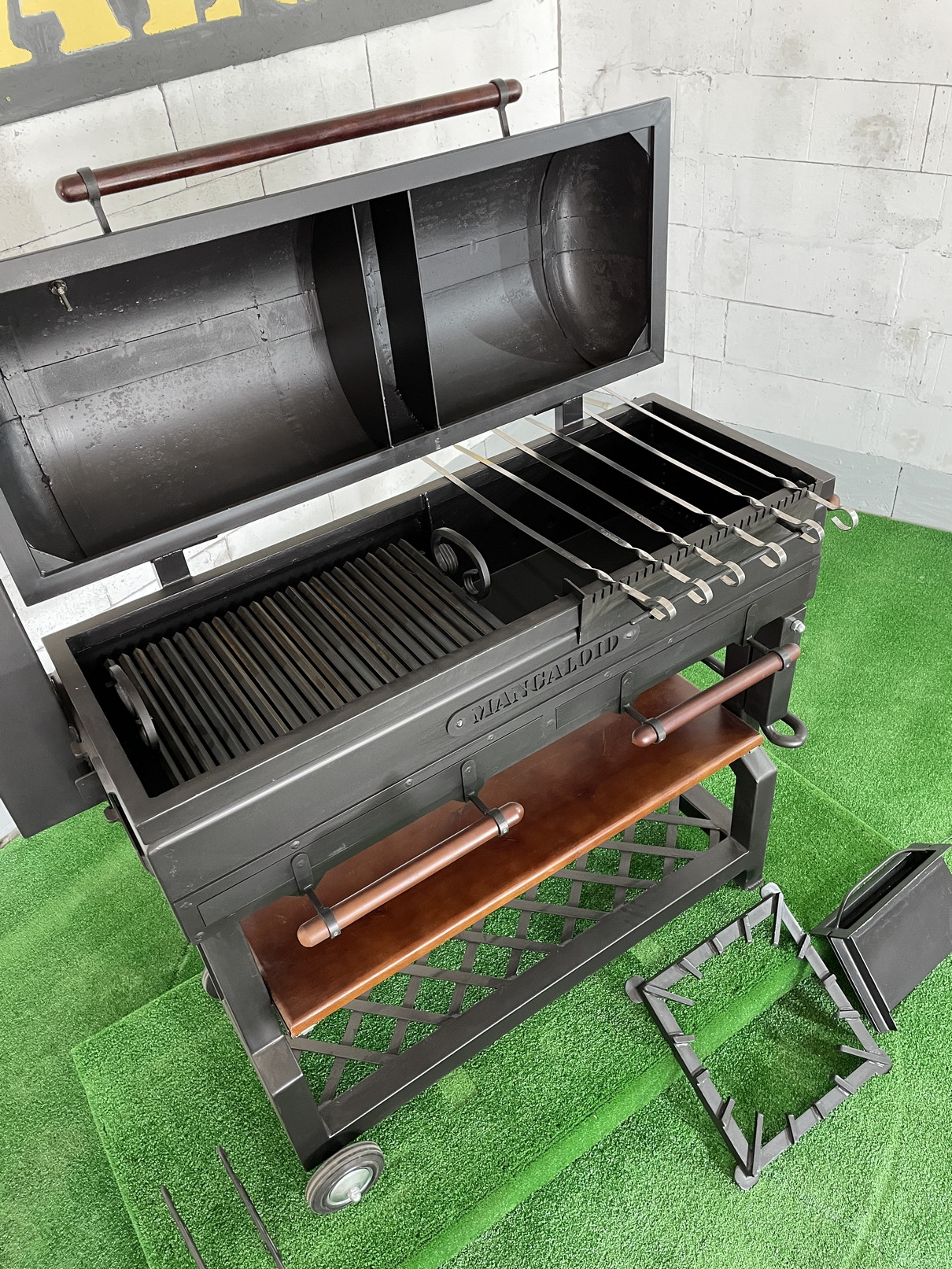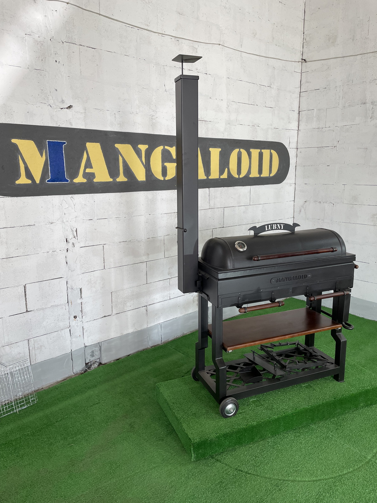 Виготовлений з листового металу 3 та 5 мм, має дуже зручну та стійку конструкцію, для легкості пересування є колеса. Може використовуватися для приготування м’яса на вугіллі та барбекю, є вставка для використовування котелка, а також додаткова система для можливості приготування продукту методом гарячого копчення. Кришка обладнана датчиком температури, та має дерев’яну ручку. Також на мангалі передбачено висувну дерев’яну поличку та стаціонарну металеву.