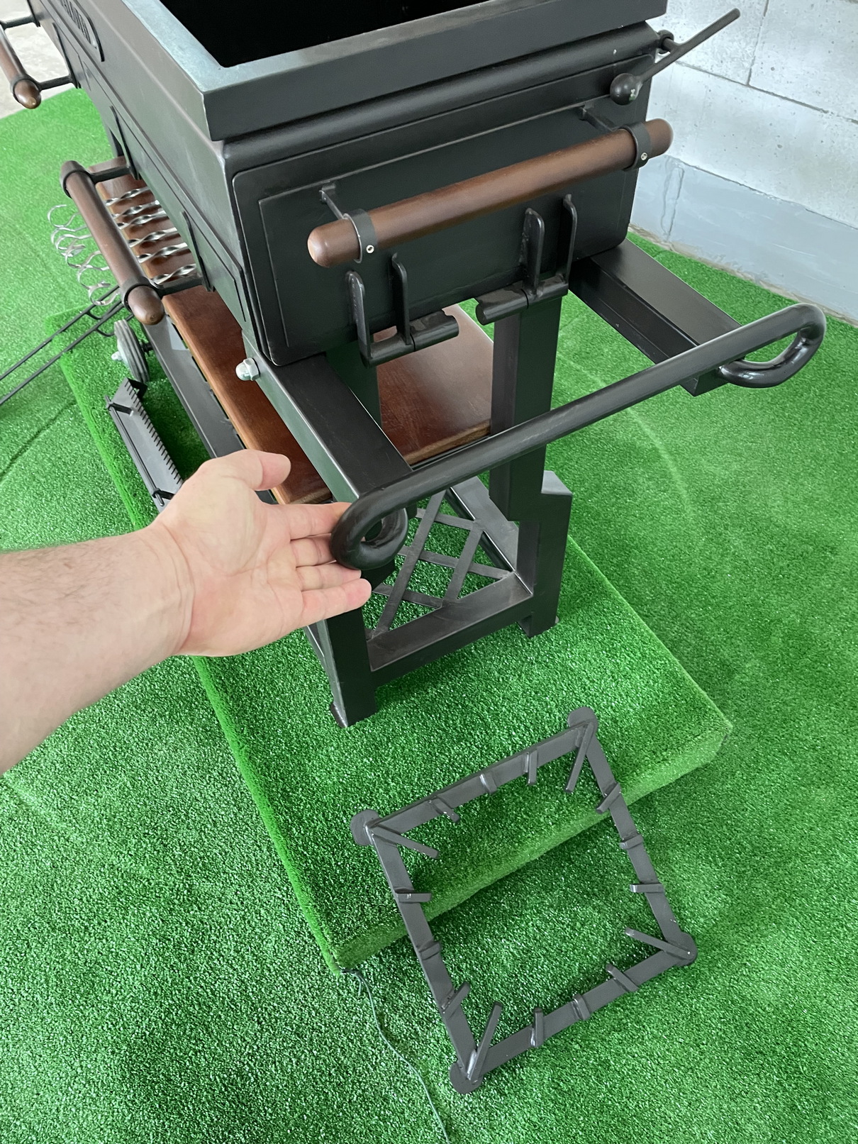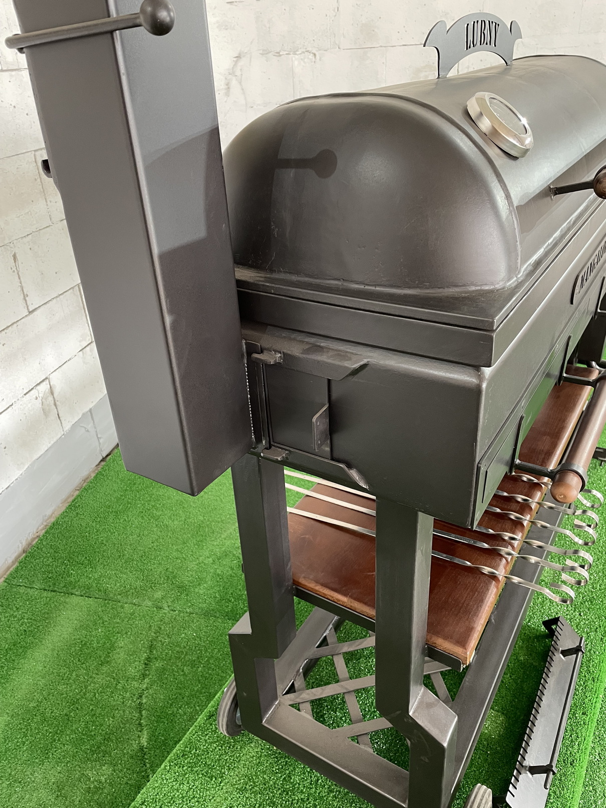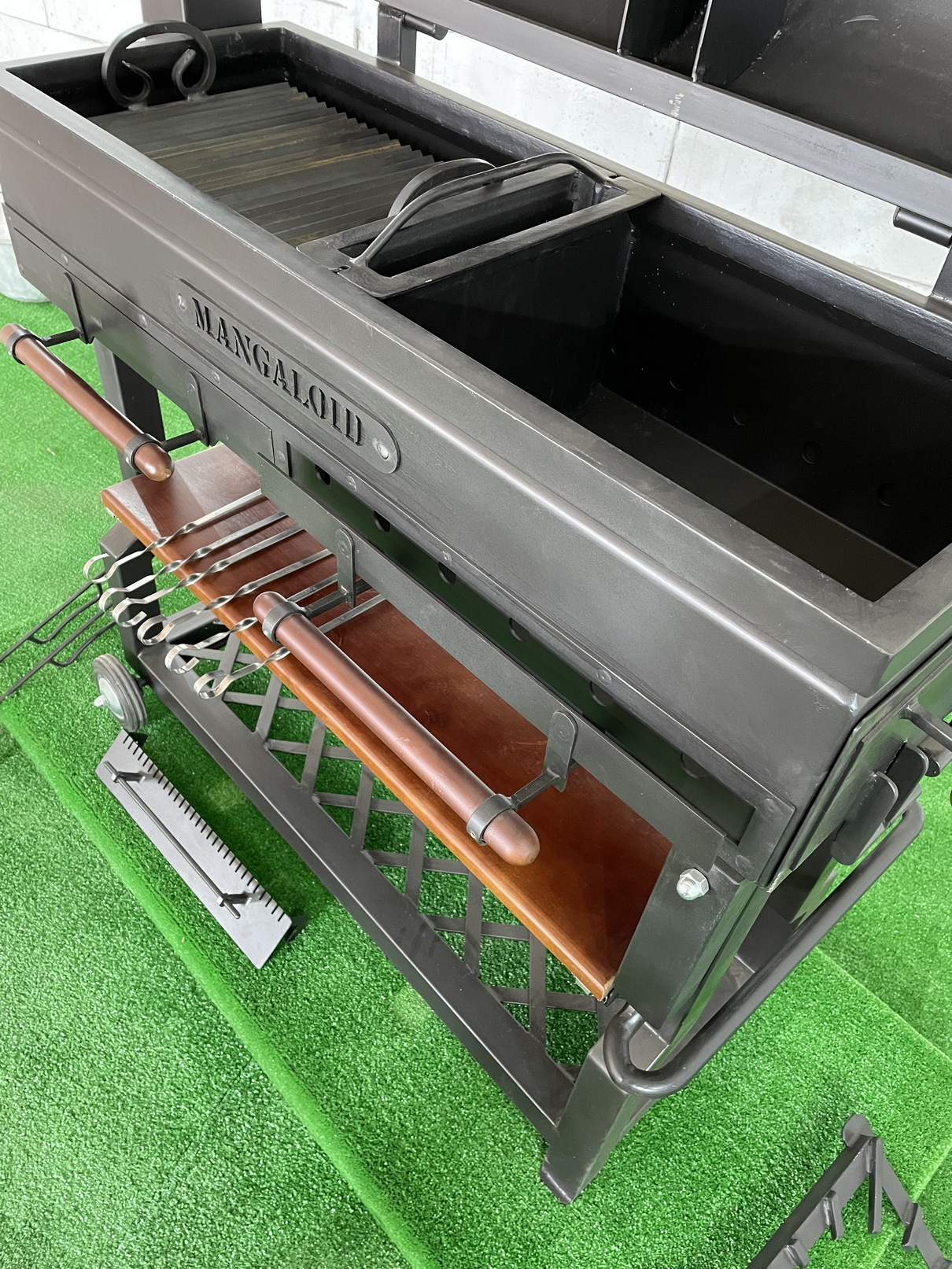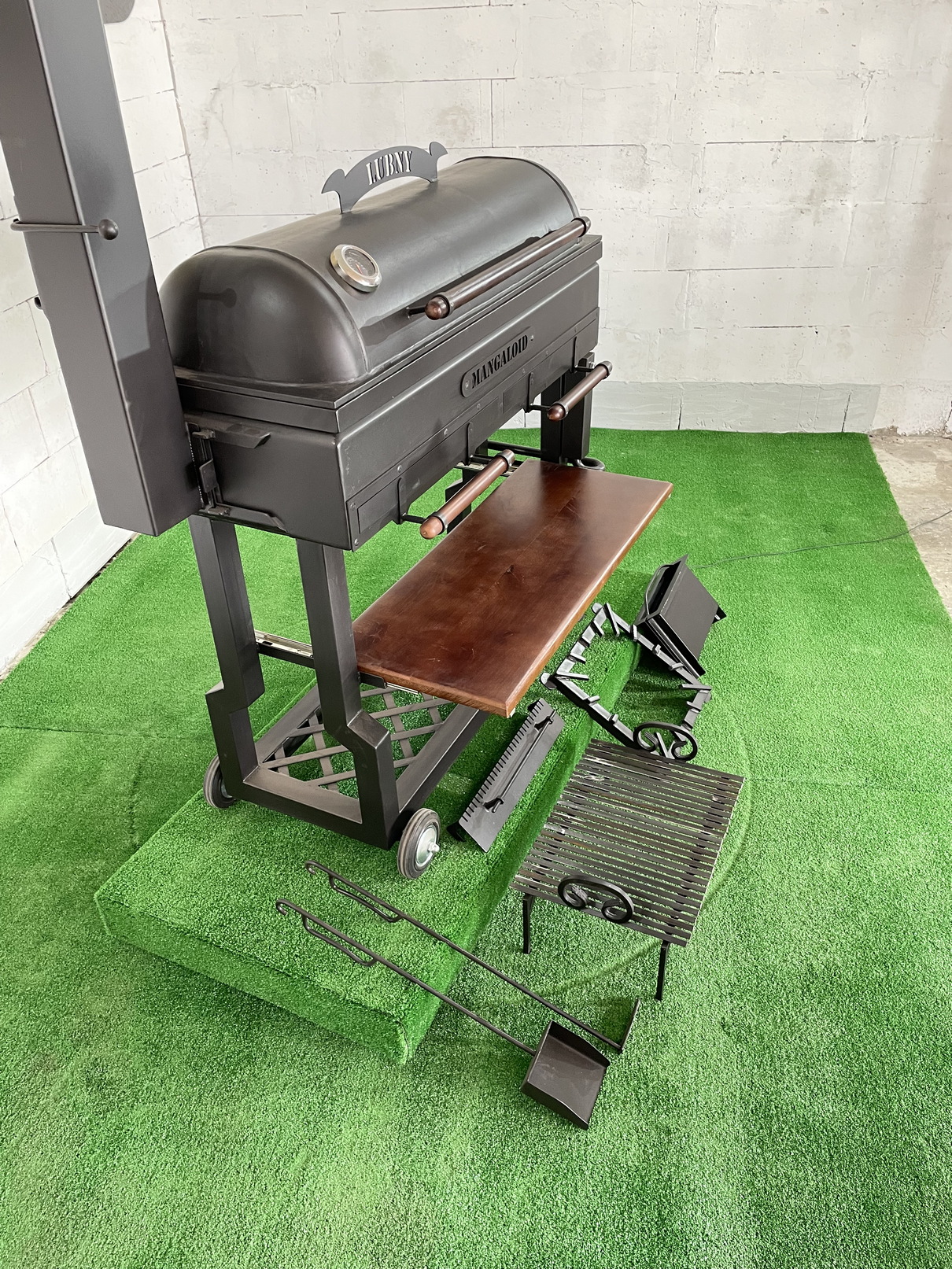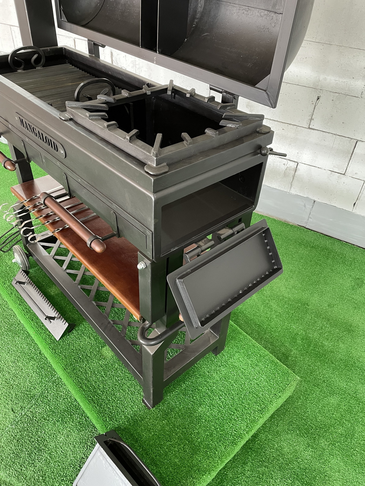 Виготовлений з листового металу 3 та 5 мм, має дуже зручну та стійку конструкцію, для легкості пересування є колеса. Може використовуватися для приготування м’яса на вугіллі та барбекю, є вставка для використовування котелка, а також додаткова система для можливості приготування продукту методом гарячого копчення. Кришка обладнана датчиком температури, та має дерев’яну ручку. Також на мангалі передбачено висувну дерев’яну поличку та стаціонарну металеву.