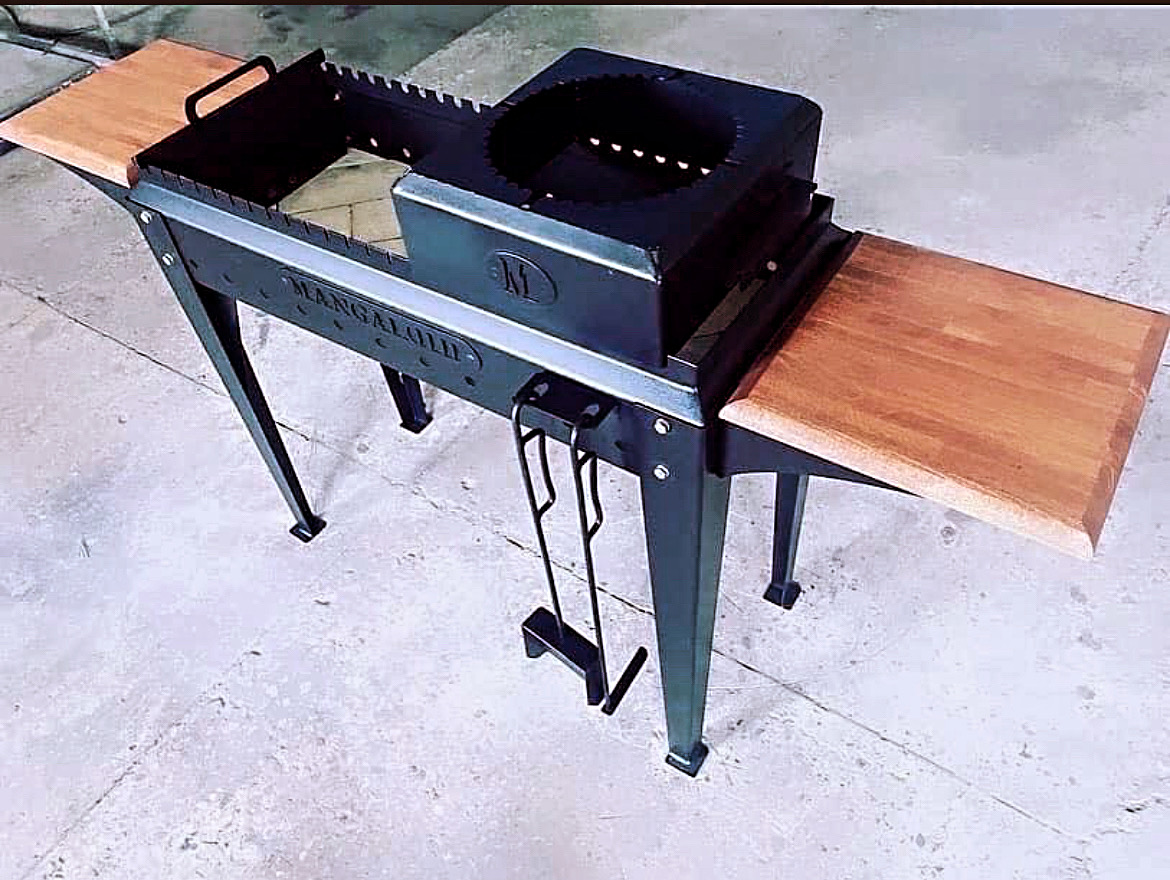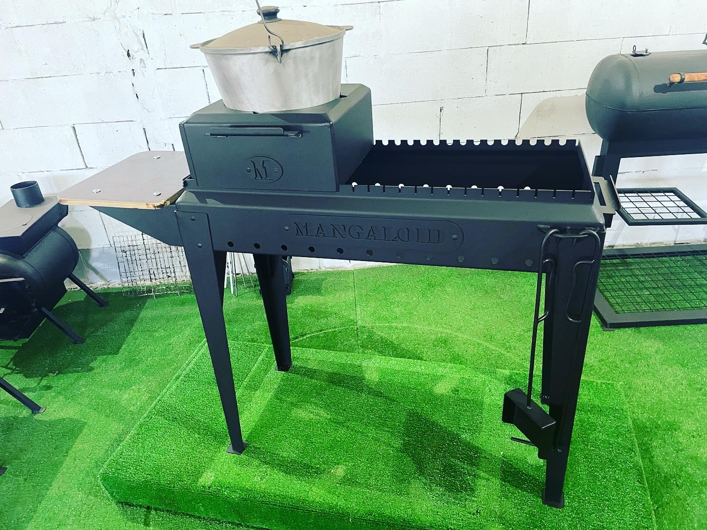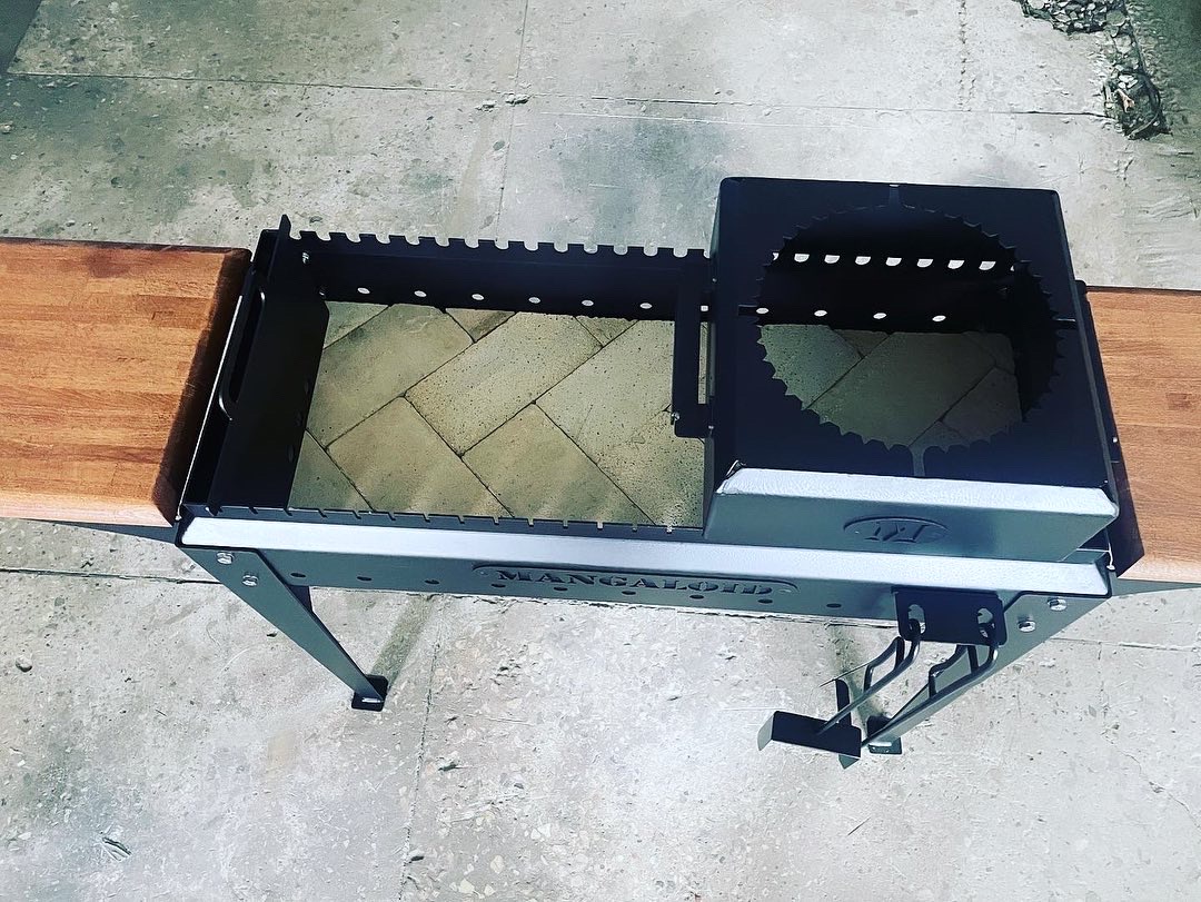 Проста та дуже функціональна конструкція на стійких знімних ( для зручності транспортування) ногах. Жаровня, для приготування м’яса на шампурах та решітках, виконана з листового металу 3 мм, довго утримує високу температуру вугілля.Є вставка для можливості застосування котелка, дві дерев’яних полички. Довго утримує високу температуру вугілля.