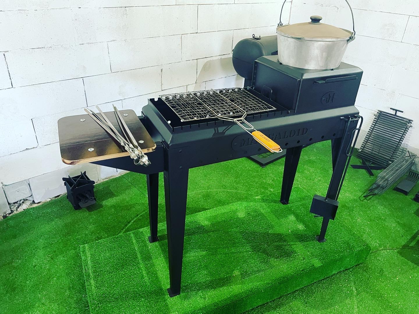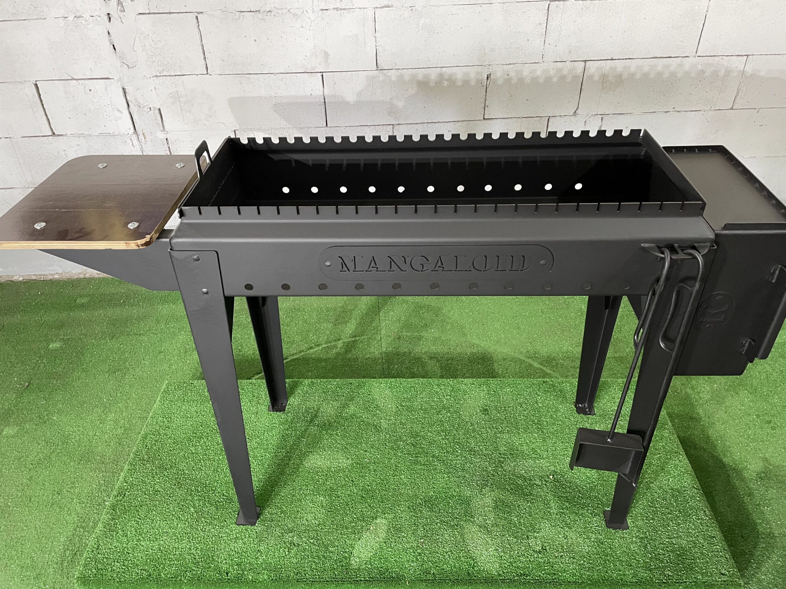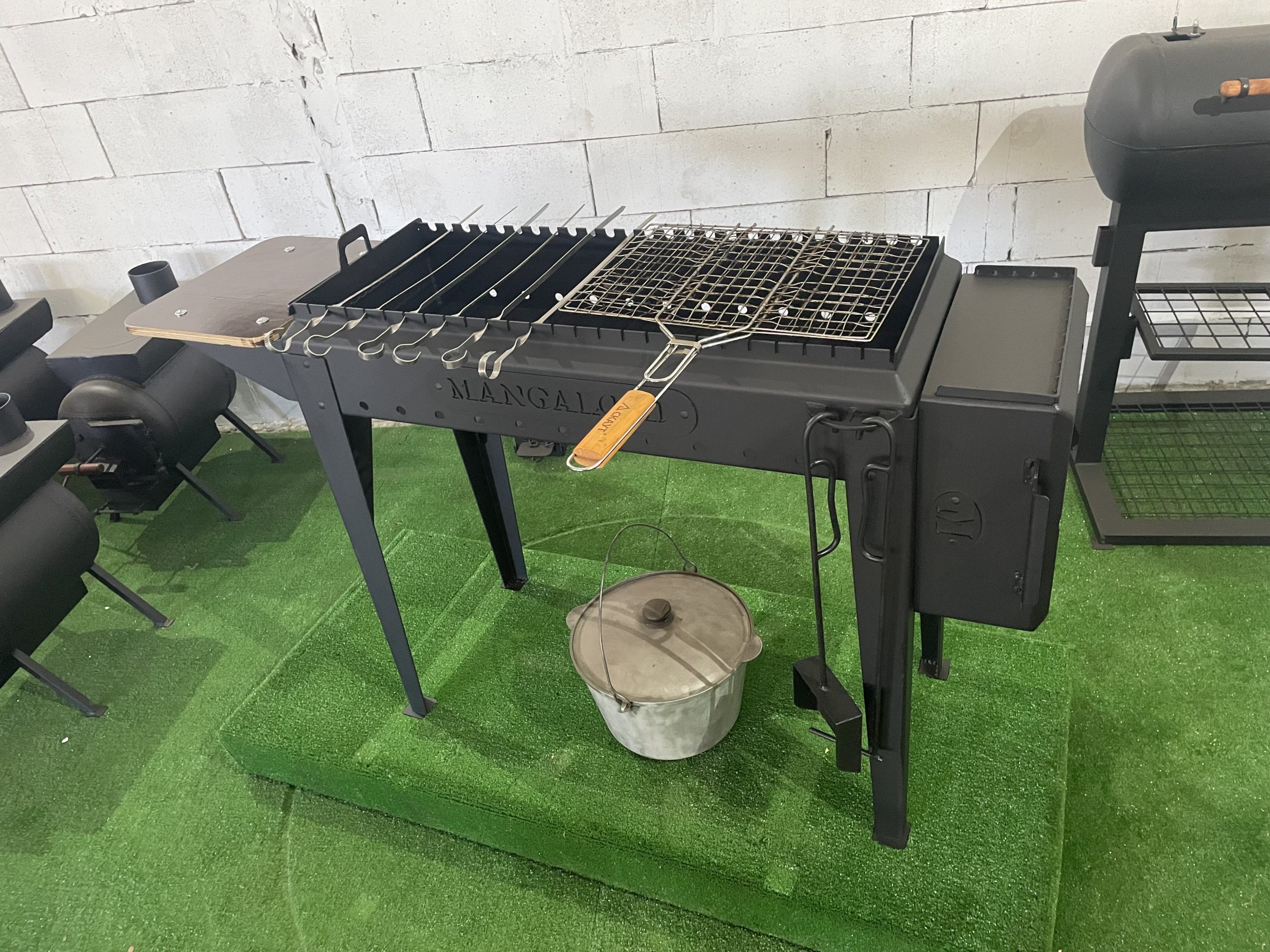 Проста та дуже функціональна конструкція на стійких знімних ( для зручності транспортування) ногах. Жаровня, для приготування м’яса на шампурах та решітках, виконана з листового металу 3 мм, довго утримує високу температуру вугілля.Є вставка для можливості застосування котелка, дві дерев’яних полички. Довго утримує високу температуру вугілля.