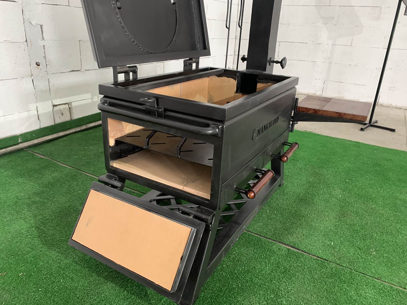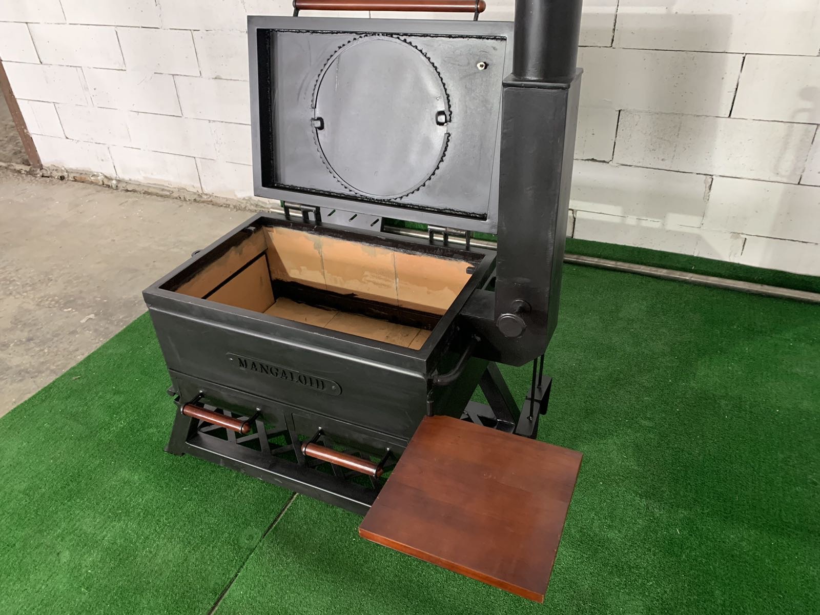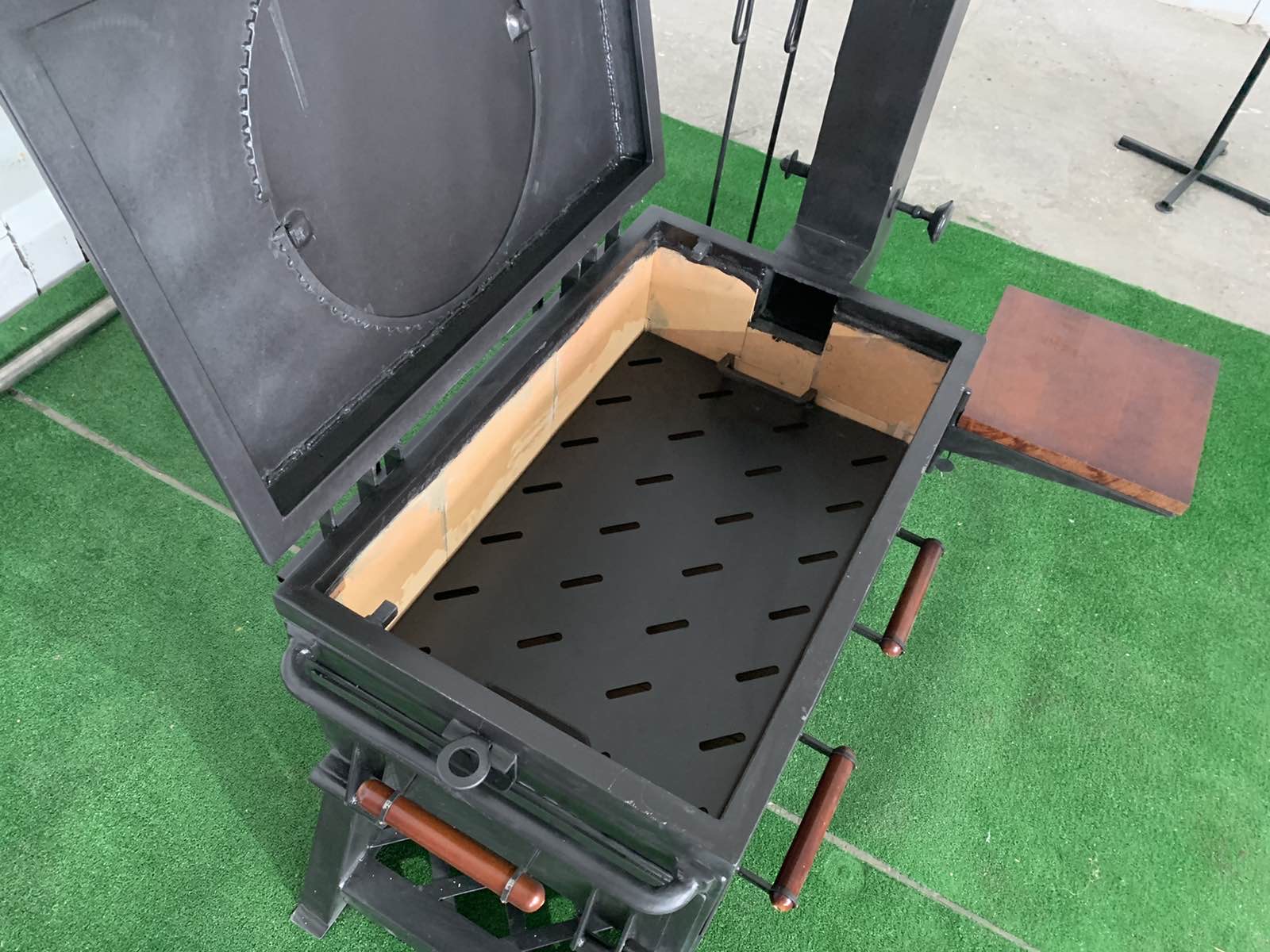 Піч достатньо велика для завантаження дров або вугілля для тривалого приготування їжі. Враховуючи наявність верхньої кришки, вона ж плита для смаження , можна використовувати піч в якості мангалу ; для цього в комплекті є додатковий лист-дно для зменшення глибини печі. Для роботи із піччю для приготування у казані, передбачено бокові дверцята для додавання дров чи вугілля.Піч вироблено із листового металу товщиною 3 мм, обладнана датчиком температури, має дерев’яні ручки для безпечного відкривання кришки, дверцят та засувів, а також дерев’яний відкидний столик. Труба для відводу диму знімна вироблена із нержавіючої сталі. Також додаються аксесуари- решітка-барбекю, кочерга 2 шт, совок для збирання вугілля, гребінка для фіксування шампурів. Є можливість додатково обладнати піч шамотним камінням для більшої акумуляції тепла.