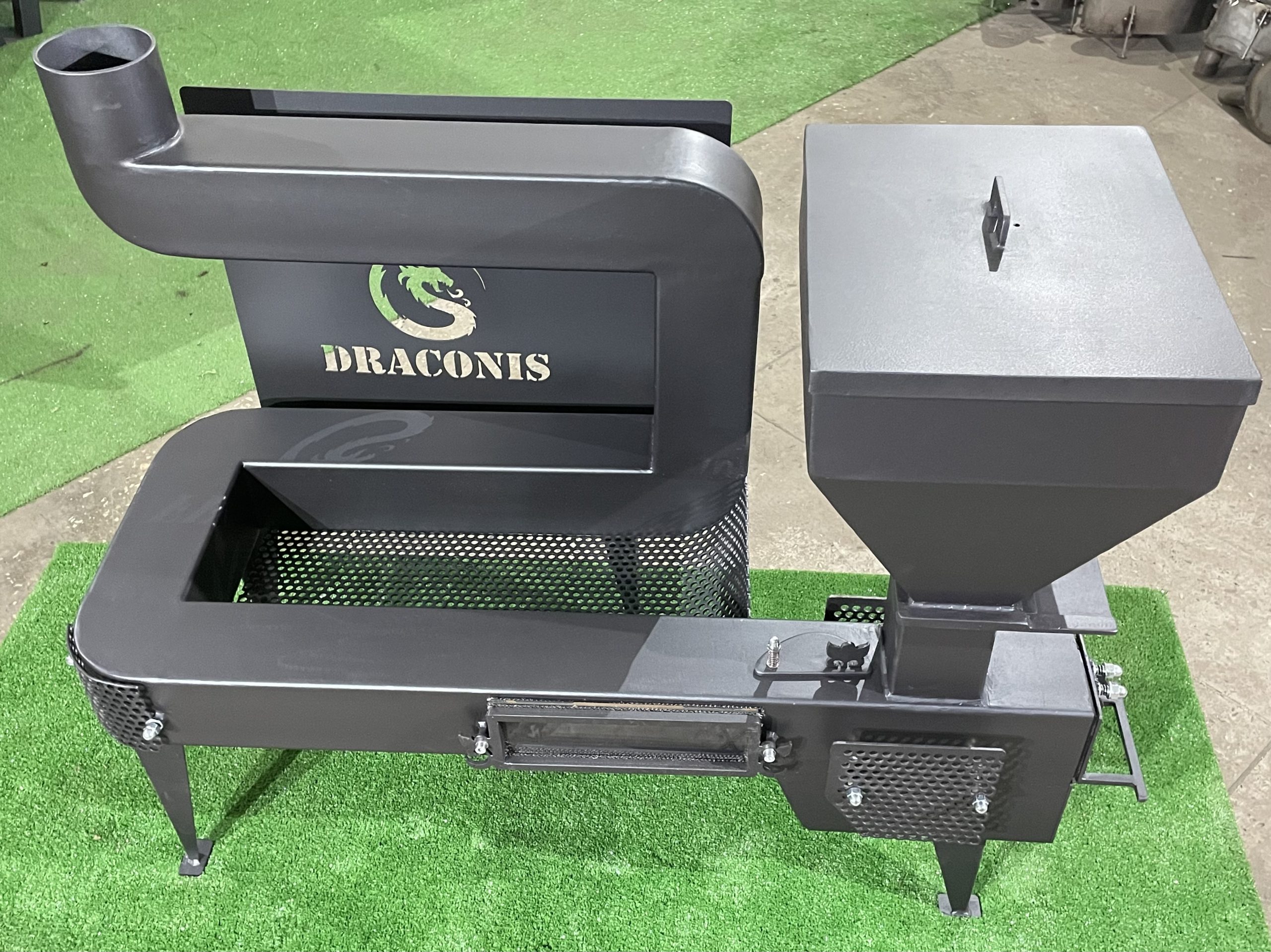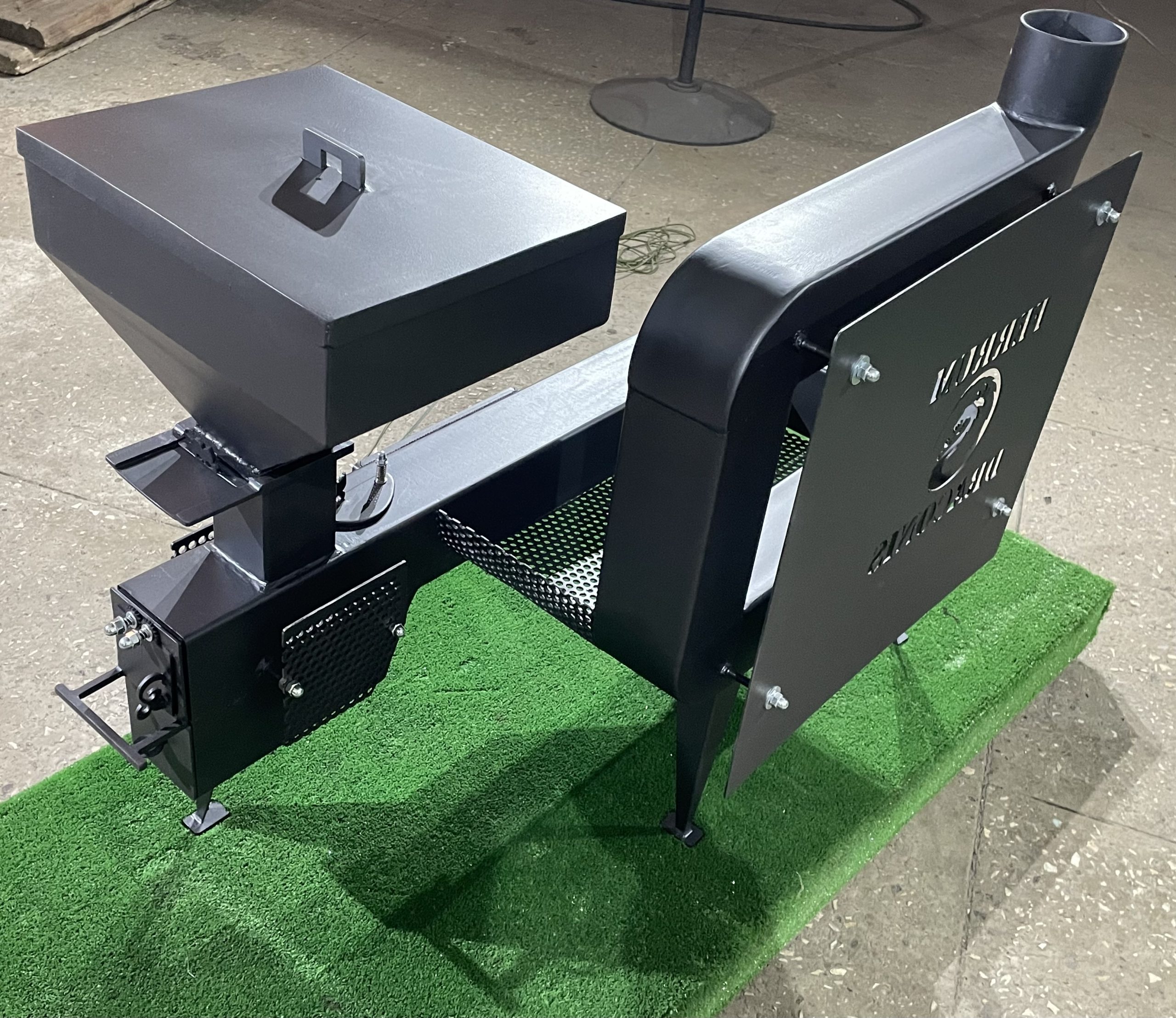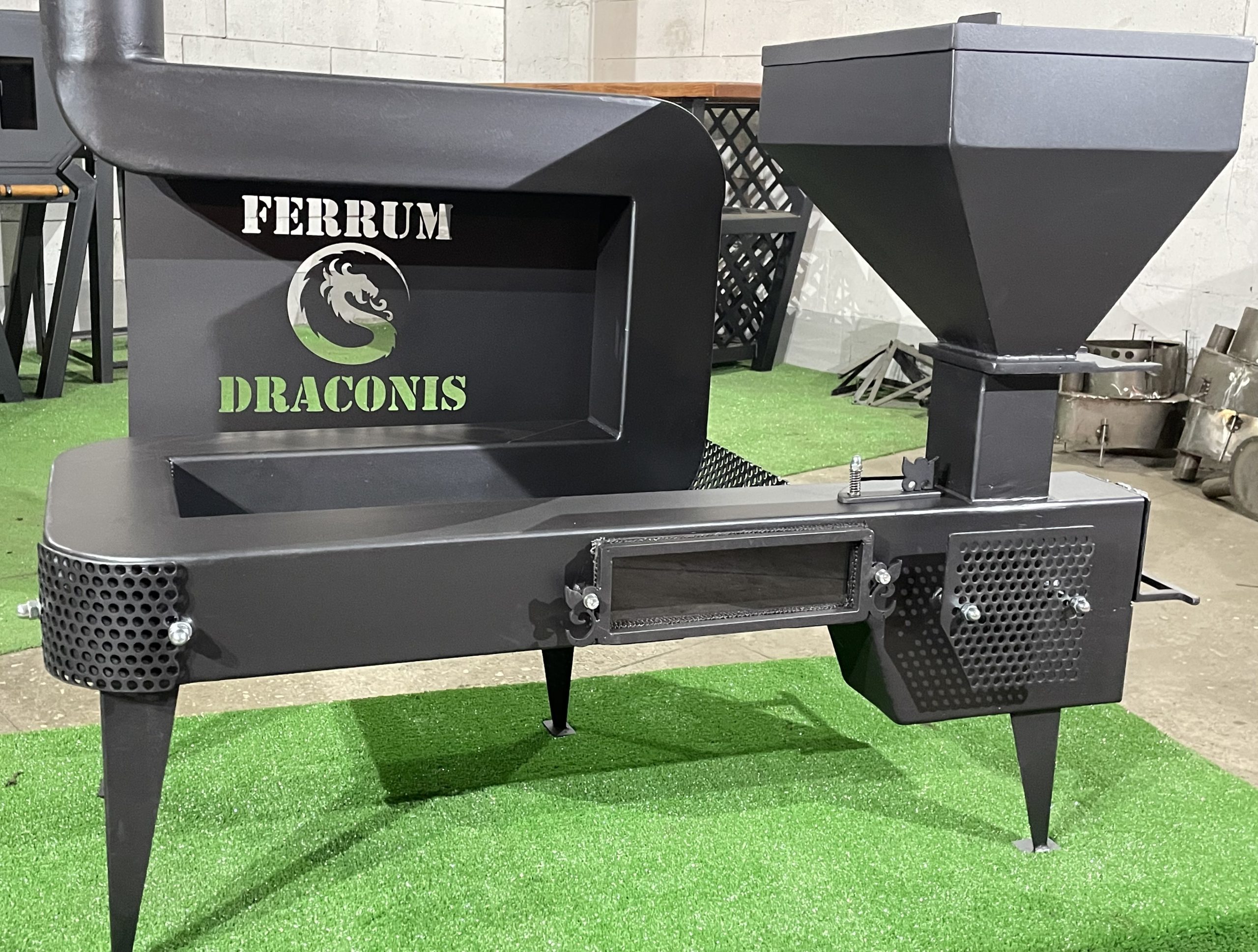 у центрі вироба є відсік для каміння (теплоакамулятор). Працює на пеллетах 8мм та 6мм завдяки змінним колісникам (з вмонтованим ручним дозатором). Витрата пального 1кг у годину. площа обігріву до 30м2